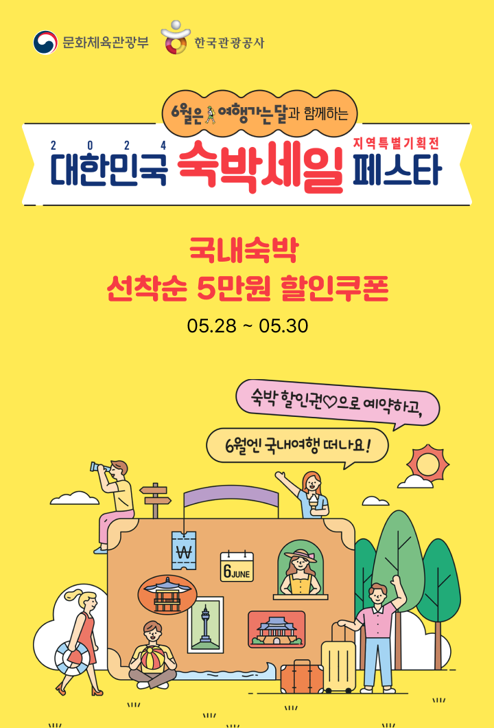 숙박세일 페스타에 참여하는 온라인 여행사를 통해 숙박 할인권을 발급 받아 행사에 참여할 수 있습니다.